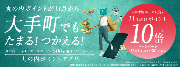 ・大手町エリア対象店舗は丸の内ポイント10倍キャンペーンを行っております。 詳しくは下記のバナーより、キャンペーン情報・対象店舗をご確認ください。